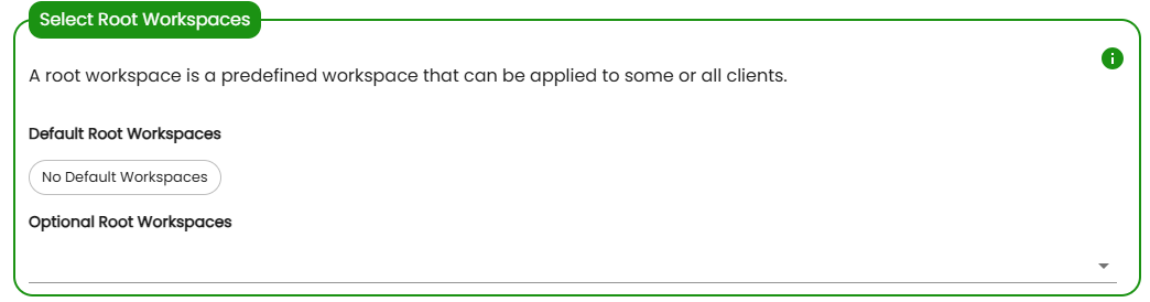 - If you have been using Basil for a while, you may have set up Root Workspaces. If so, when you add a new client, you’ll have the option to associate this new client with those Root Workspaces. If you have set up a Root Workspace to be assigned to "All Clients", then that Root Workspace will appear here as well, listed as a “Default Root Workspace”.