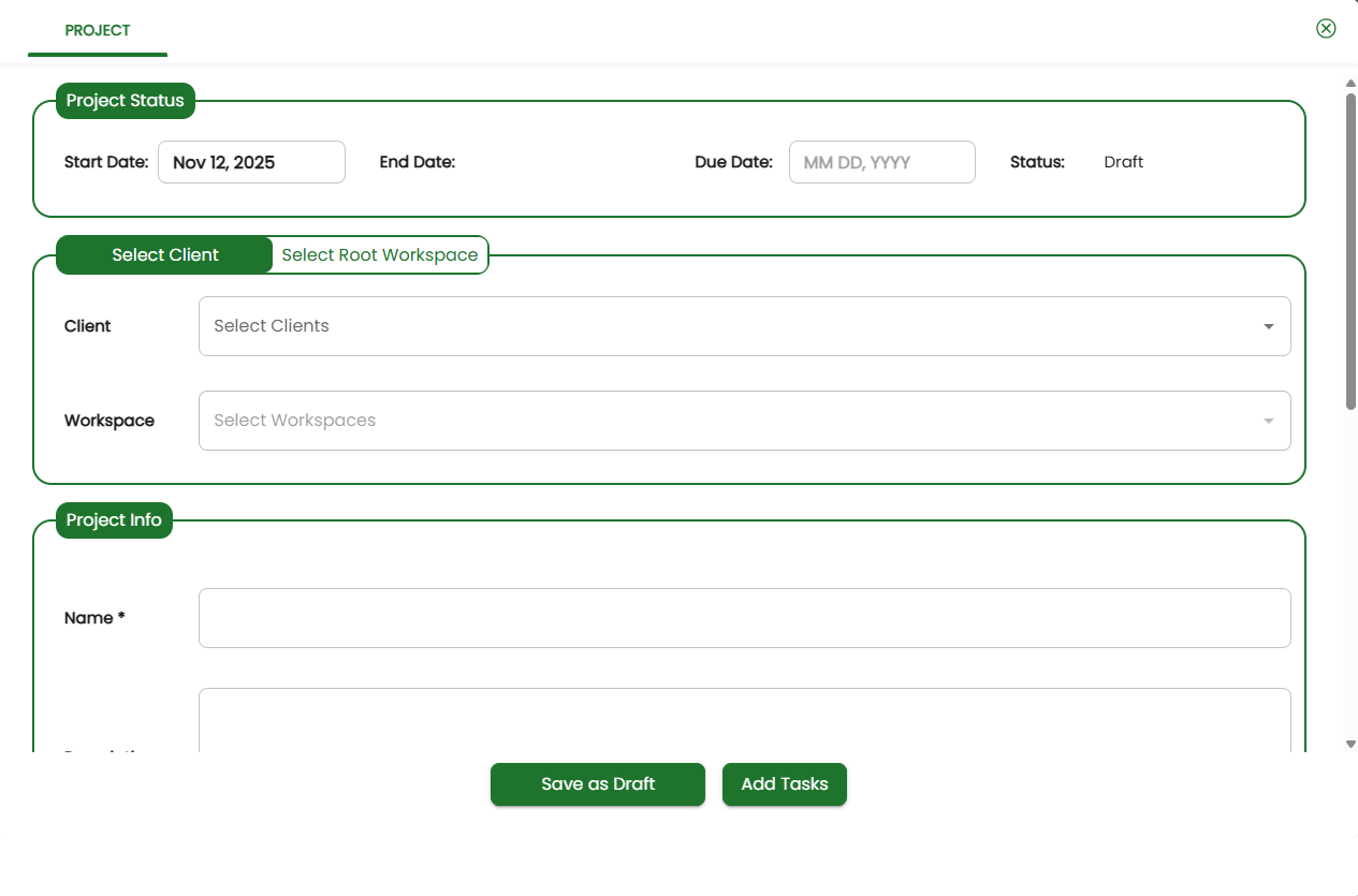 - Select Dates and Clients - Select the Start Date of the Project which will also serve as the default Start Date for the Tasks added to the Project. You can also select the Due Date of the Project as well, which will default the Due Dates of the Tasks added to the Project. Next, assign the Project to at least one Client and Workspace