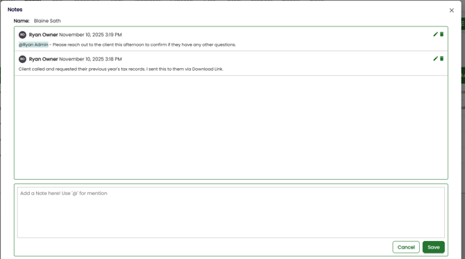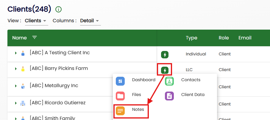 You can add notes in paragraph format to your Clients. This can be useful for logging miscellaneous information such as meetings or call logs with the client. In the People tab with the List view selected, click the Quick Actions bolt icon for the Client you’d like to add notes to, then click ‘Notes’.