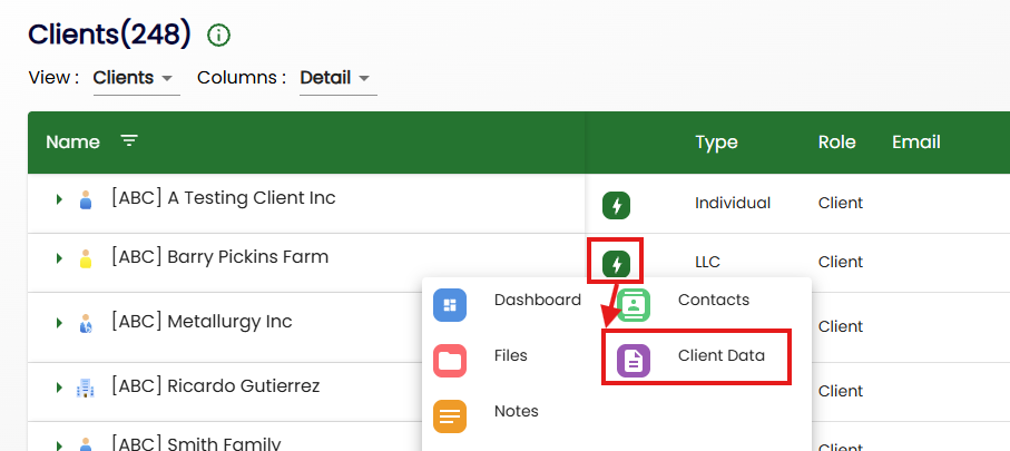 Once the fields are defined, you and your team can now view and edit the Client Data for each of your Clients in the People tab in the List view by clicking the Quick Actions bolt icon to the right of the client you’d like to add data to, then click ‘Client Data’.