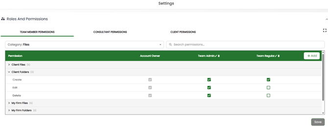 From there, click 'Roles And Permissions' to expand the section, select the role category (Team Member, Consultant, or Client), and select the Category.
