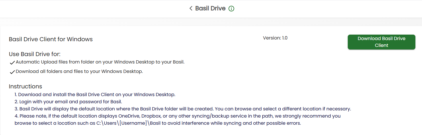 This will take you to the Basil Drive download page. Click the ‘Download Basil Drive Client’ button to download and run the setup.exe file to install the Basil Drive Client.