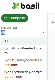 Now when composing or forwarding an email from the Email tab in Basil, the ‘From:’ field will appear, allowing you to toggle between email addresses.