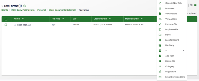 Lock for Client - Prevents primary users and client users from opening or downloading the file. This could be useful if you don’t want the client to acquire their tax return until they’ve paid their invoice, for example. Only Account Owners ,Team Members, and Consultants with the 'Client Lock' permission (Settings > Roles And Permissions > Category: People) can lock or unlock files for clients. Once locked, if the client tries to view or download that file, they will get a message 'The file is locked. Please contact the Account Owner.' Your team can unlock the file again for clients by clicking the Actions button and clicking 'Unlock for Client'.