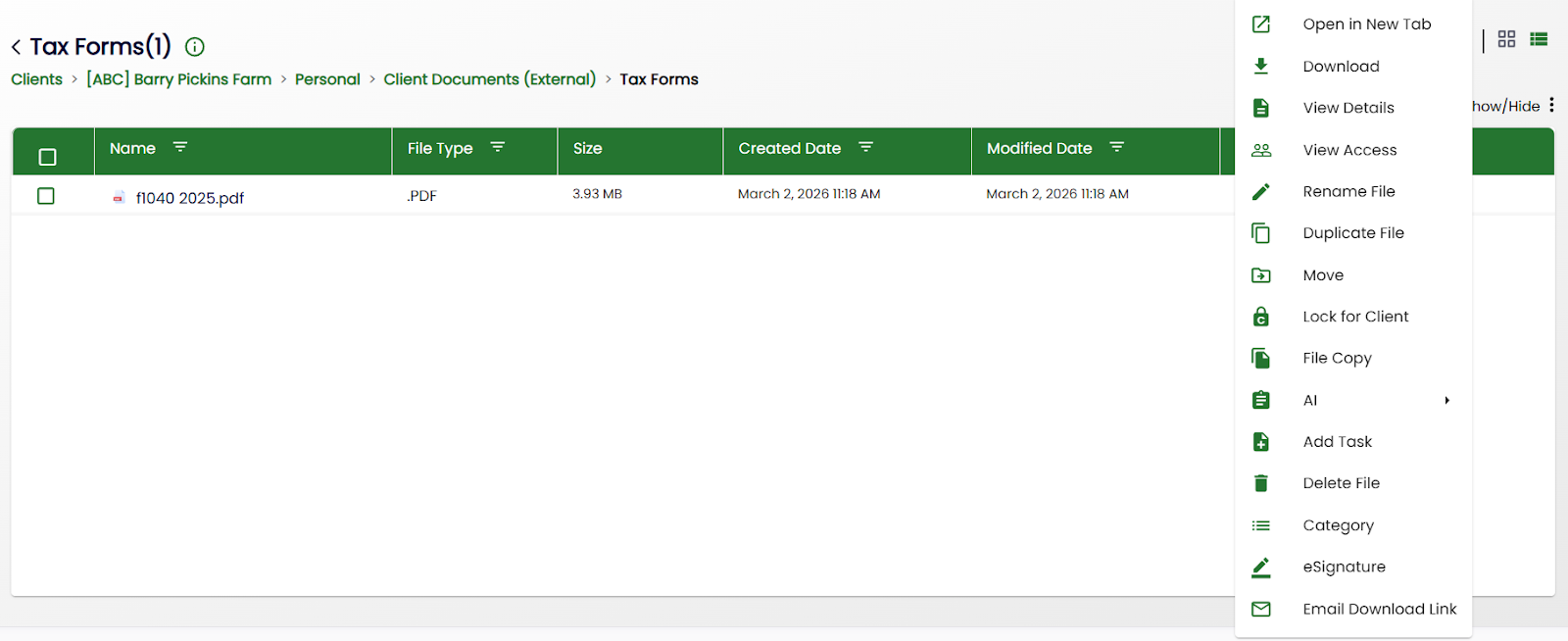 Move - Moves the file or folder to any other available folder, including My Firm folders or other Clients’ folders. If a file of the same name already exists in the destination folder, the file will not be moved, and you will receive an error message indicating that the file already exists.