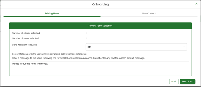 Next, you’ll be presented with a summary screen indicating how many users will be sent the form. You’ll also have the option to enable the Cora Assistant which will send out email reminders on set intervals to the recipient until the form has been completed. A message can also be added.