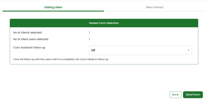 Next, you’ll be presented with a summary screen indicating how many users will be sent the form. You’ll also have the option to enable the Cora Assistant which will send out email reminders on set intervals to the recipient until the form has been completed.