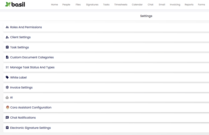 The Basil Account Owner can access global settings by going to their initials on the top-right of Basil and clicking ‘Settings’.