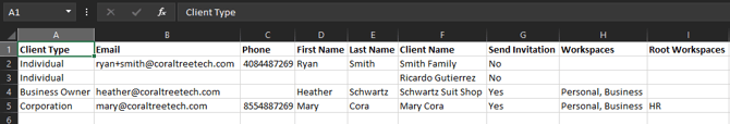 - Column H - Workspaces (Optional): Workspaces break down your client into different sections. You can leave this empty to just have the default single workspace, which you can add more to later. Use commas to separate each Workspace name, do not use quotes. Example: Business Taxes, Personal Taxes, Sales Department