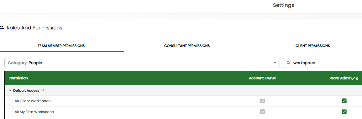 The Account Owner can adjust permissions to allow default access to all Client Workspaces or My Firm Workspaces for specified Team Member or Consultant roles by going to Settings > Roles And Permissions > Category: People > Default Access. For example, clicking the ‘All Client Workspace’ checkbox for a role will make all Clients show when they go to the People tab, and unchecking it will remove access to all Clients for that role.