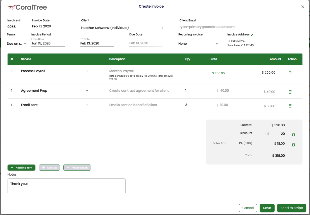 Client invoices (non-QBO) can now be sent through Stripe by clicking ‘Send to Stripe’ when creating an invoice.