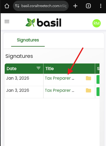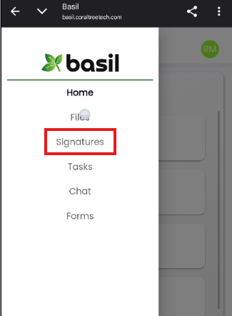 If signing while logged into Basil on mobile, tap the three lines on the top-left and tap ‘Signatures’.