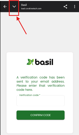 After submitting the first page, you will be prompted to input a verification code that was emailed to you. If you have issues navigating back to your inbox to receive the verification code, look for and tap a minimize button from the Basil verification screen (in Chrome, it may look like a down arrow on the top-left).