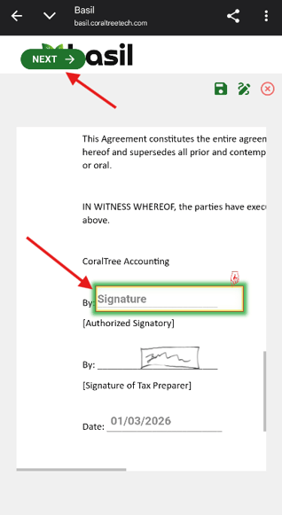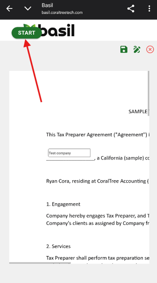 Accept Basil’s agreement and you will see your document. You can tap START on the top-left to be brought to the first field that needs your attention. You can tap the field to sign or fill it in. Tap NEXT on the top-left to go to the next field.