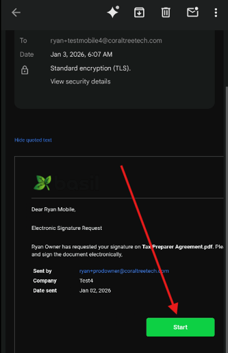 While viewing a signature request email from your inbox (such as Gmail), tap ‘Start’.