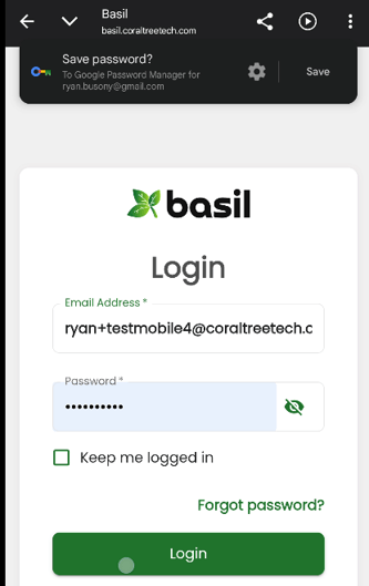 Once your account is created, you can launch the My Basil iOS app or go to the Basil site (https://basil.coraltreetech.com/) on a mobile web browser, such as Chrome or Safari. Input your email address and password. You can reset the password if needed (https://basil.coraltreetech.com/forgot_password).