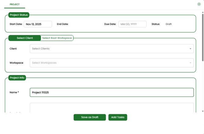- Select Client: Allows you to choose the client(s) or your firm, and a workspace for each. You can also apply the project template to any Root Workspaces you may have created.