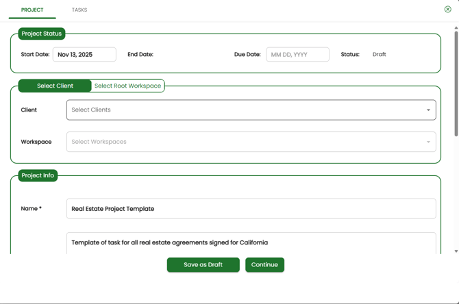 At the bottom are two buttons: “Save as Draft”, and “Continue”. “Save as Draft” will save the templated project and allow you to come back to it later for further editing. Clicking “Continue” will advance you to the next step, changing the buttons at the bottom (adding a “Save as Template” button and a “Launch” button) and adding a “Tasks” tab at the top-left, which allows you to edit the details of the Project’s nested Tasks.