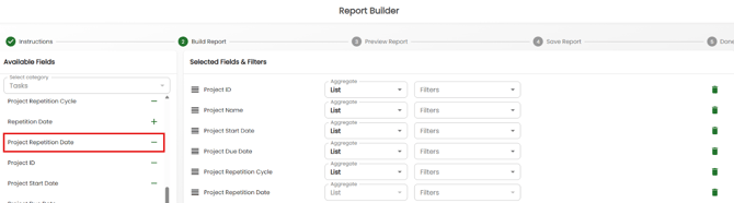 First, go to the Reports tab and click the Report Builder button on the top-right. Create a Report using the ‘Task’ category. Add the field ‘Project Repetition Date’, along with other fields that you prefer. See the image below for reference.