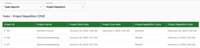 Click Next to see a preview, and click Next again to name the report. Proceed to finalize the report. You can then view the Report from the Reports tab by selecting the category ‘Tasks Reports’ and locate your Report name in the Reports dropdown. You can see each Project’s projected next occurrence creation/start date by seeing the ‘Project Repetition Date’ column.