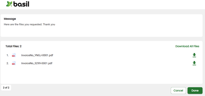 When you need to give someone access to a file in the Basil platform, you can do so with a secure download link. Similar to the upload link, this will be a secure, one-time use link that allows them to download the specific file. The link will expire after 7 days if not acted on.