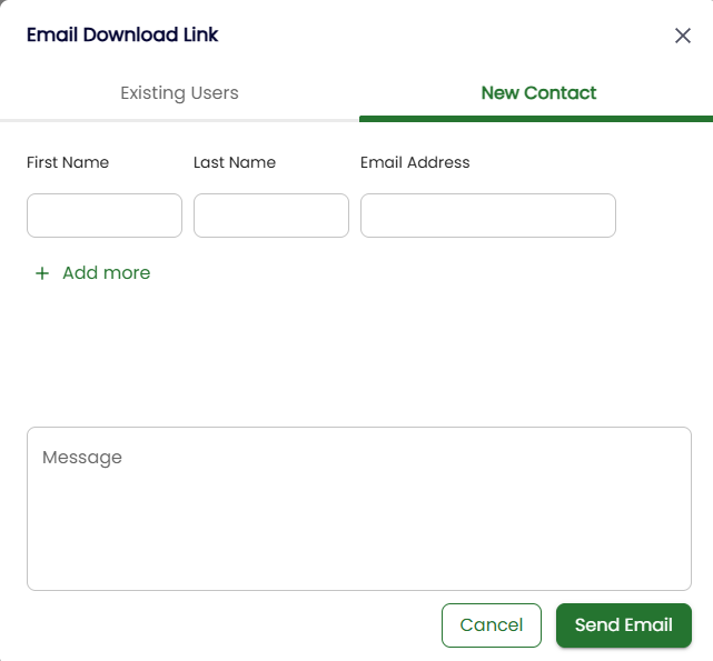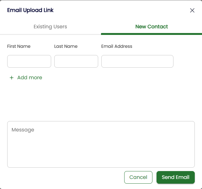A contact form window will open. You can select an existing contact or create a new contact. If there is more than one person who needs to submit a file to this same folder, you can click on the ‘+ Add More’ option and type in the information of additional people. You can also include a message to provide additional information or instructions when viewing the page to upload files.