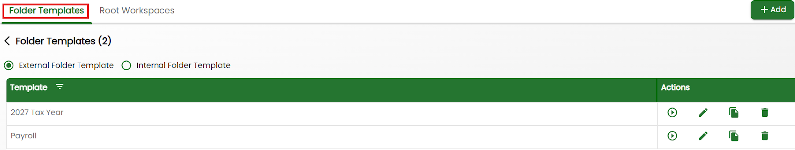 - Folder templates can be added to a Root Workspace at any time.