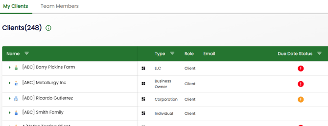 To see which Clients have tasks approaching their due dates (if the Due Date Tracker is enabled by your Account Owner), navigate to the ‘People’ tab. With default settings, Basil uses the following symbols to visually alert you to critical deadlines: A red (!) symbol indicates the task is due in one day or is overdue, and an orange (!) symbol indicates the task is two days away from its due date.