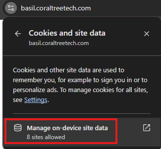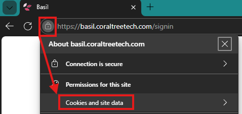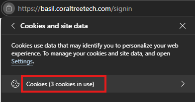 1. In Edge's address bar, directly to the left of the basil.coraltreetech.com URL, click on the lock icon and click 'Cookies and site data'