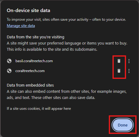 3. Click the trash bin icon to the right of each of basil.coraltreetech.com and coraltreetech.com, then click 'Done'