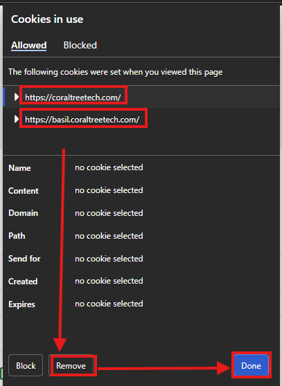 3. Click the row for https://basil.coraltreetech.com/ and click Remove. Repeat for the https://coraltreetech.com/ row, then click 'Done'