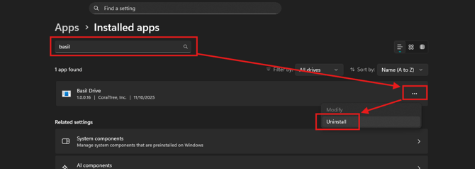 - Uninstall Basil Drive through Windows Settings or Control Panel