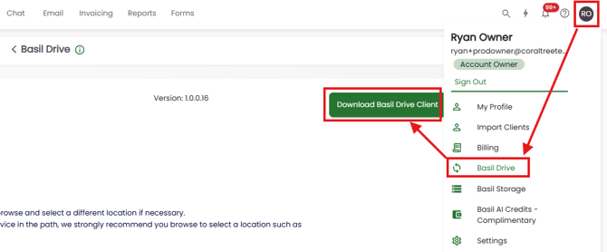 - On your web browser, log into the Basil website as the Account Owner, click your icon on the top-right, click 'Basil Drive'. Then click 'Download Basil Drive Client' on the next page.