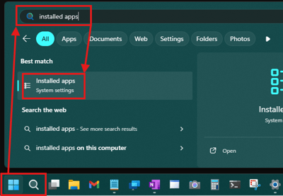 - Go to the Windows Start Menu or Search bar and type 'installed apps' or 'Apps & features'.