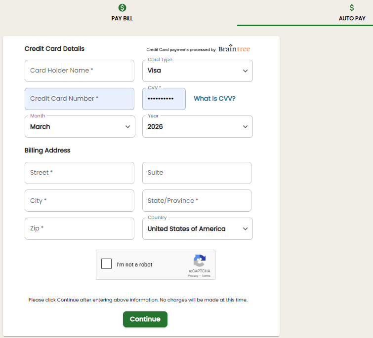 Enter your credit card information, complete the CAPTCHA, and click ‘Continue’. Auto Pay payments attempt to process every night.