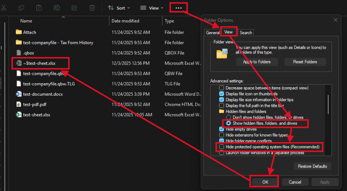 6. You should see a file with the same name of the file in question plus a "~$" prefix (such as ~$test-sheet.xlsx). Delete that file.