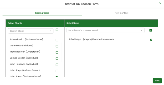 After clicking on the 'Send Form' option, you can select the appropriate Clients and Users whom you’d like to fill out the form. The list of people who appear will consist of the following for each selected Client: