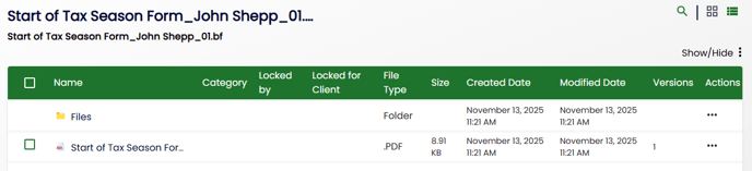 This folder will display the form responses saved as a PDF and all uploaded files. You can view these files directly or move them to the client's appropriate workspace for easier future access.