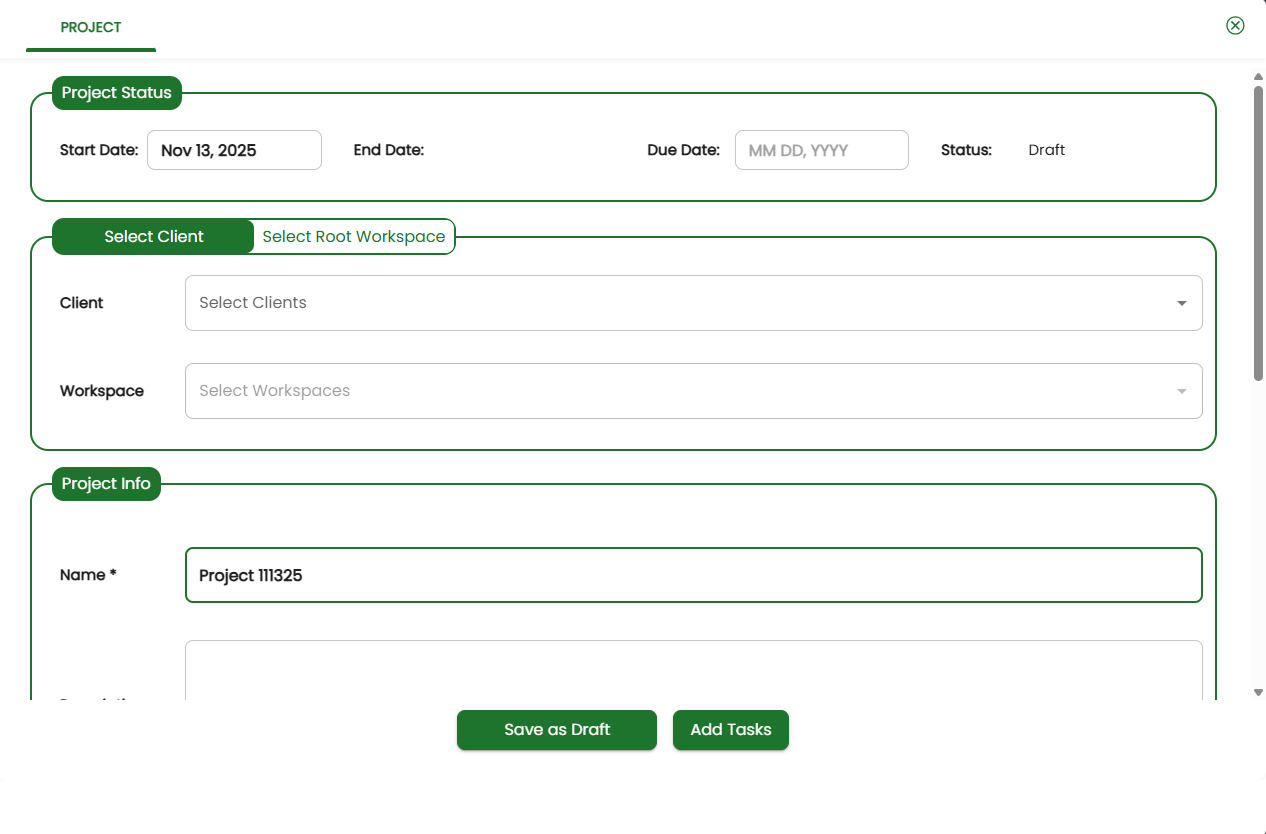 Step 3: Before we can create the Project Template, we need to go through some setup. On this first screen, the only required field is the Name field under the Project Info section. Everything else is optional. After entering the name and any other fields you want to fill out, you can either click the “Save as Draft” button at the bottom to come back to it later, or you can click the “Add Tasks” button at the bottom and proceed to the next page.