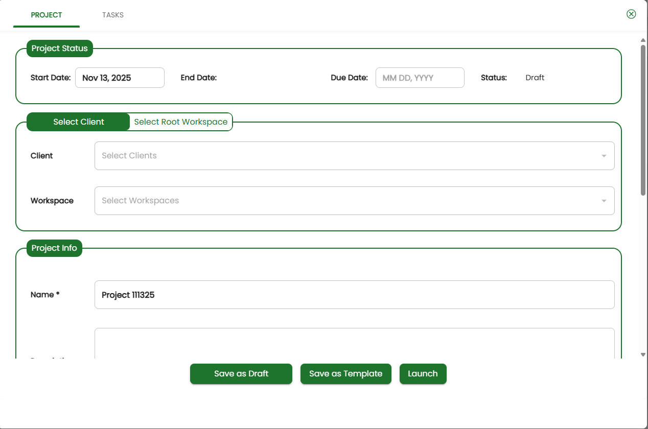 At the bottom are two buttons: “Save as Draft”, and “Save Project”. “Save as Draft” will save the templated project and allow you to come back to it later for further editing. Clicking “Save Project” will finalize the application of the template and create a new project. It will also change the buttons at the bottom (adding a “Save as Template” button and a “Launch” button) and add a “Tasks” tab at the top.